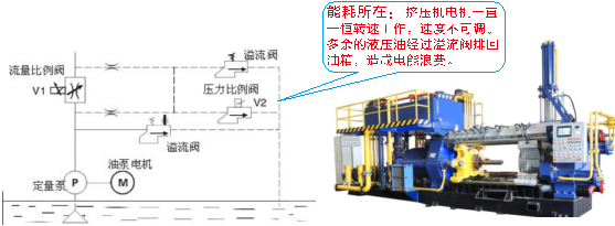 鋁型材擠出機(jī)節(jié)能 擠出機(jī)工作過程一般分為上料、頂緊、擠壓、退后、切斷、等幾個(gè)階段,各階段需要的流量和壓力都不同,其中擠壓的時(shí)間較長(zhǎng)(90%),耗能較多(90%),其速度和壓力是靠流量比例閥和壓力比例閥來調(diào)節(jié),通過調(diào)節(jié)流量比例閥和壓力比例閥的開啟度來控制流量和壓力大小。對(duì)于油泵馬達(dá)而言,是長(zhǎng)期處于全速工作狀態(tài);擠壓過程是處于變化的負(fù)載狀態(tài),在擠出機(jī)的液壓系統(tǒng)中,油泵提供變化的流量,但電機(jī)還是恒定轉(zhuǎn)速不變的,還是有多余的液壓油通過溢流閥回流到油箱,此過程稱為高壓節(jié)流。能量損失高達(dá)15%~35%。因油泵的供油量與電機(jī)的轉(zhuǎn)速成正比,因此我們可以通過調(diào)節(jié)油泵的供油量與擠出機(jī)的實(shí)際流量需求相一致,消除溢流現(xiàn)象,以達(dá)到節(jié)能的目的。