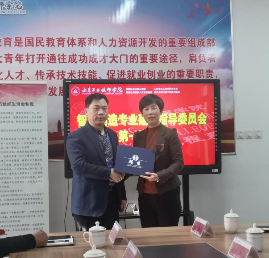 本次大會山東工業(yè)技師學(xué)院還聯(lián)合西門子(中國)有限公司、費斯托(中國)有限公司、GF加工方案、山東奧卓電氣科技發(fā)展有限公司等部分知名企業(yè),成立了智能制造專業(yè)建設(shè)指導(dǎo)委員會。工作人員宣讀了《智能制造專業(yè)建設(shè)指導(dǎo)委員會章程》和委員會主任委員、副主任委員、委員名單,公司總經(jīng)理張慶平代表山東奧卓電氣科技發(fā)展有限公司被聘任為智能制造專業(yè)建設(shè)指導(dǎo)委員會副主任委員。