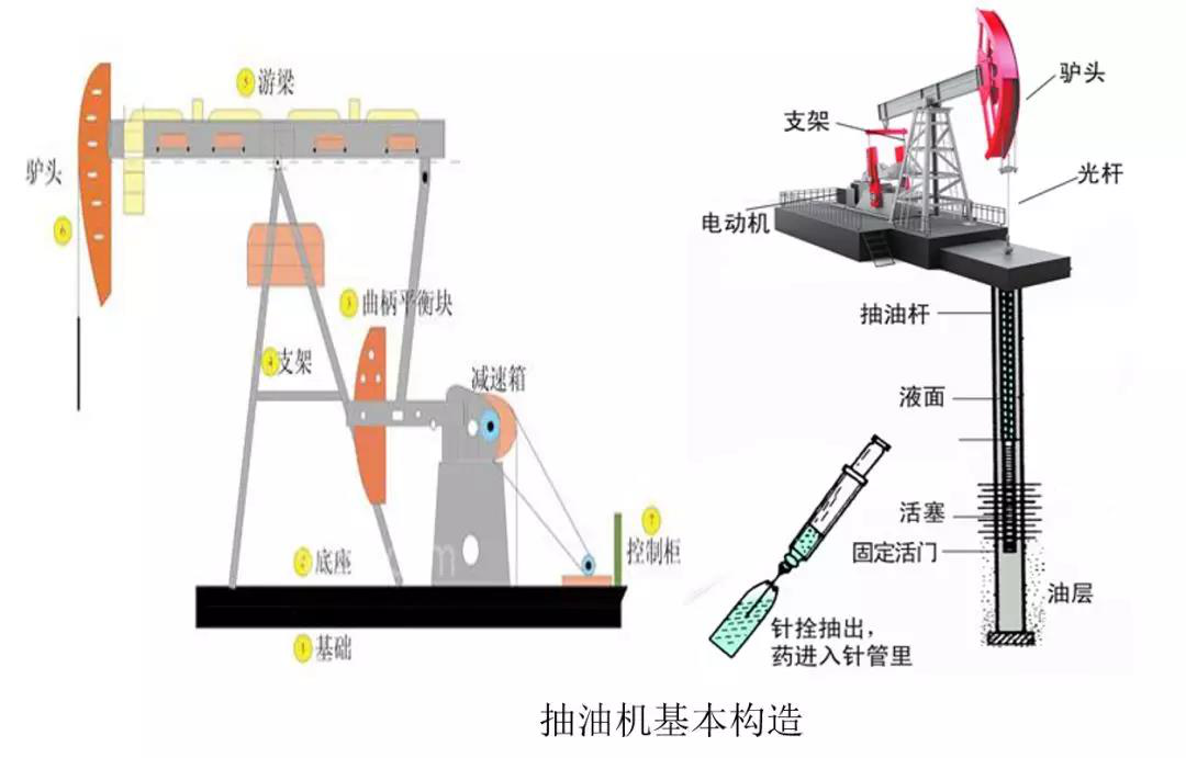 2) 井下部分:抽油泵(吸入閥、泵筒、柱塞和排油閥),它懸掛在套管中的下端;