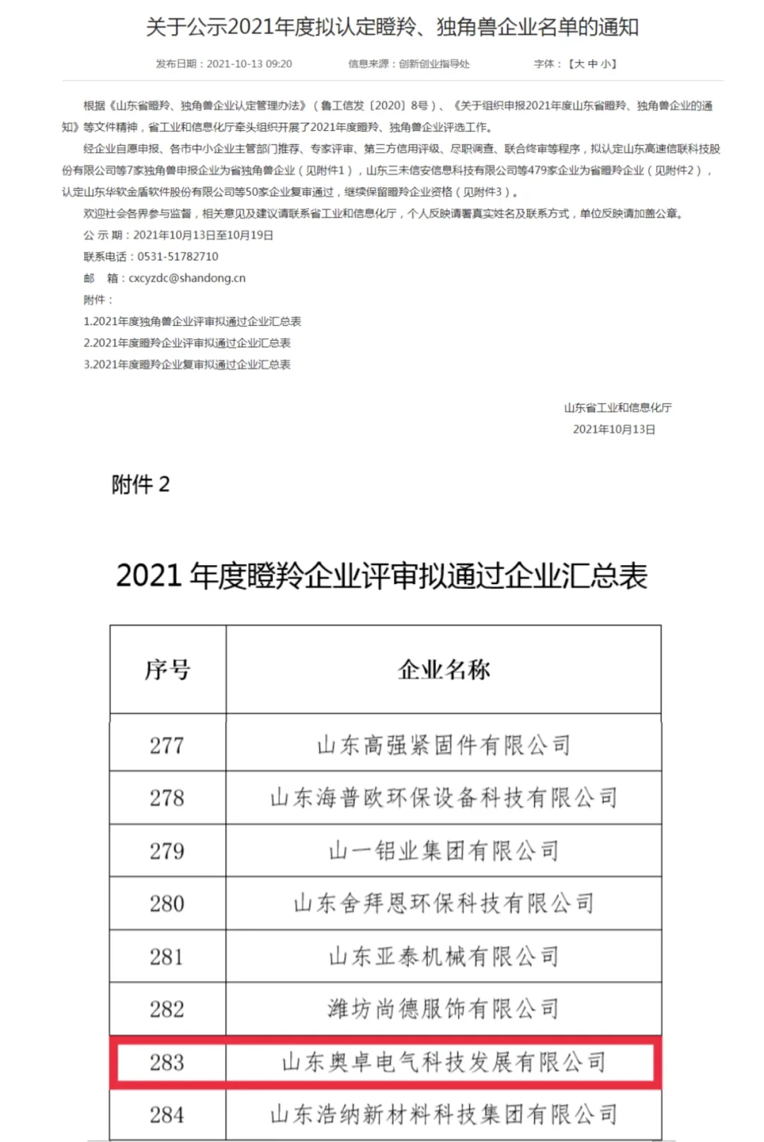 2021年10月20日,經(jīng)過山東省工業(yè)和信息化廳2021年度瞪羚、獨(dú)角獸企業(yè)名單的公示,山東奧卓電氣科技發(fā)展有限公司憑借近年在科技創(chuàng)新中取得的成果榮獲了山東省2021年度“瞪羚企業(yè)”稱號。