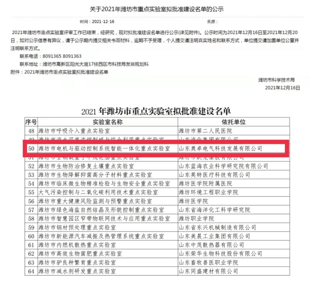 2021年12月21日,經(jīng)過濰坊市科學(xué)技術(shù)局關(guān)于2021年濰坊市重點(diǎn)實(shí)驗(yàn)室批準(zhǔn)建設(shè)名單的公示,山東奧卓電氣科技發(fā)展有限公司申報(bào)的“濰坊市電機(jī)與驅(qū)動(dòng)控制系統(tǒng)智能一體化重點(diǎn)實(shí)驗(yàn)室”榜上有名,成功獲批建設(shè)濰坊市重點(diǎn)實(shí)驗(yàn)室。