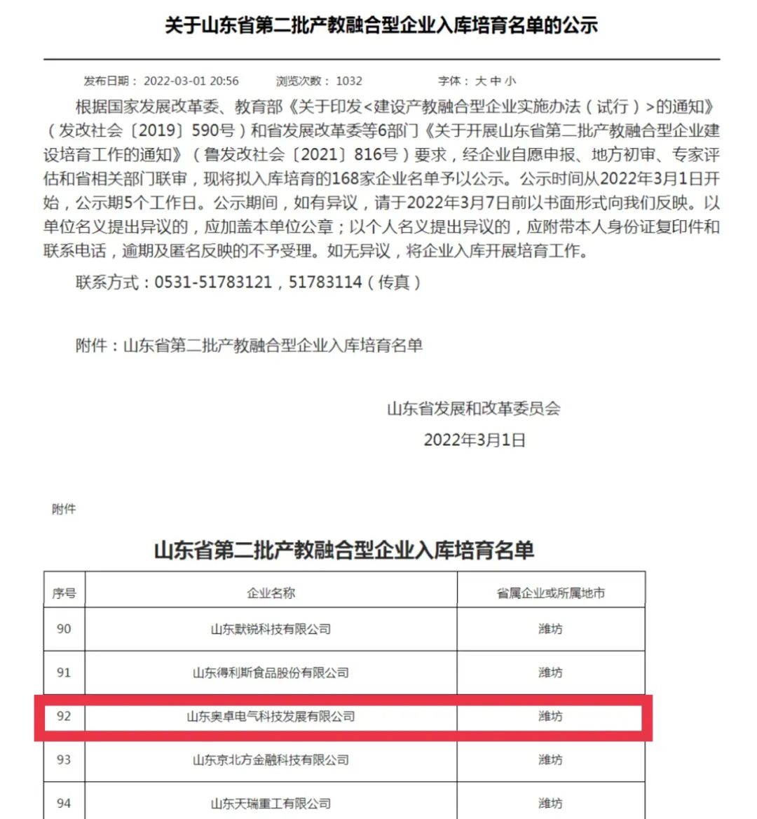 近日,山東省發(fā)展和改革委員會下發(fā)了《關于山東省第二批產(chǎn)教融合型企業(yè)入庫培育名單的公示》,山東奧卓電氣科技發(fā)展有限公司成功入選山東省第二批產(chǎn)教融合型企業(yè)入庫培育名單,這標志著奧卓科技在產(chǎn)教融合深化改革中所發(fā)揮的示范作用取得了一定的業(yè)績和公眾的認可。