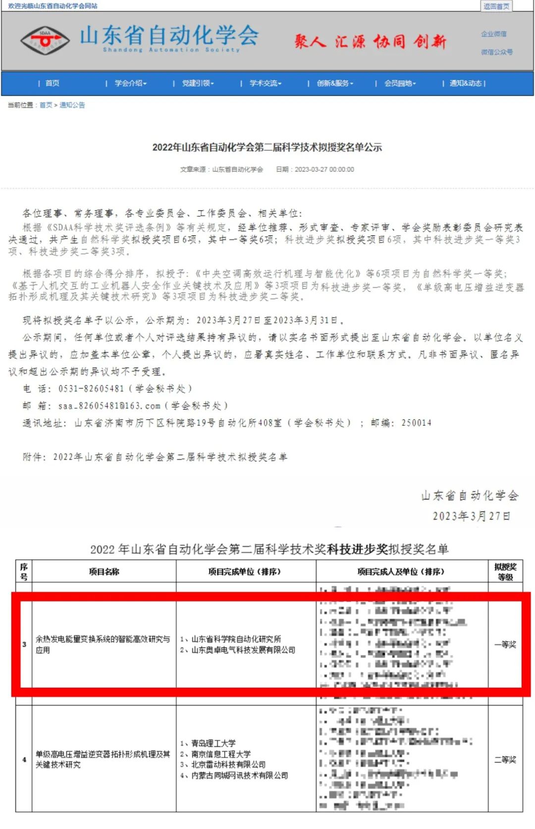 2023年3月27日,山東省自動(dòng)化學(xué)會(huì)發(fā)布了“2022年山東省自動(dòng)化學(xué)會(huì)第二屆科學(xué)技術(shù)擬授獎(jiǎng)名單公示”,截止到3月31日,公示期結(jié)束,山東奧卓電氣科技發(fā)展有限公司與山東省科學(xué)院自動(dòng)化研究所共同申報(bào)的科研項(xiàng)目《余熱發(fā)電能量變換系統(tǒng)的智能高效研究與應(yīng)用》榮獲2022年山東省自動(dòng)化學(xué)會(huì)第二屆科學(xué)技術(shù)獎(jiǎng)科技進(jìn)步獎(jiǎng)一等獎(jiǎng)。
